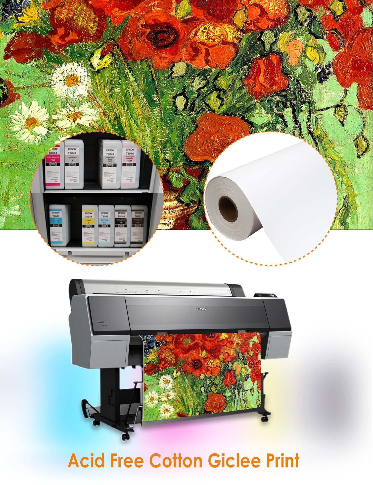 - For giclée printing, the paper or substrate used to actually print the final piece must be acid free and consist of a 100% cotton base.